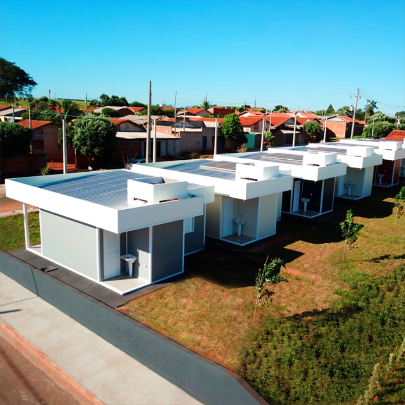 Casas modulares produzidas em fábrica e montadas no local, com tecnologia offsite de alto desempenho.